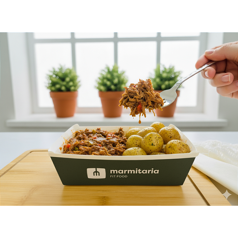 Saboreie a Carne Louca com Batata Bolinha da Marmitaria Fit Food. Um prato repleto de sabor e nostalgia!