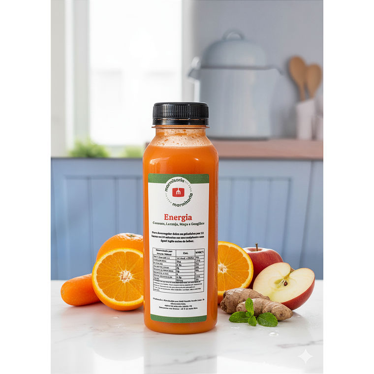 Experimente o suco Energia da Marmitaria Fitfood! Uma combinação refrescante e nutritiva de cenoura, laranja, maçã e gengibre em 300ml, ideal para aumentar sua energia e acelerar o metabolismo. Perfeito para um impulso de vitalidade a qualquer moment