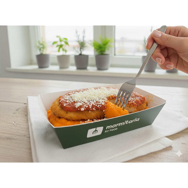 Parmegiana de Frango com Purê de Cenoura da Marmitaria Fit Food: uma escolha deliciosa e saudável. Desfrute de um prato cheio de sabor, com ingredientes de alta qualidade, perfeito para manter a dieta sem abrir mão do prazer. Experimente agora!